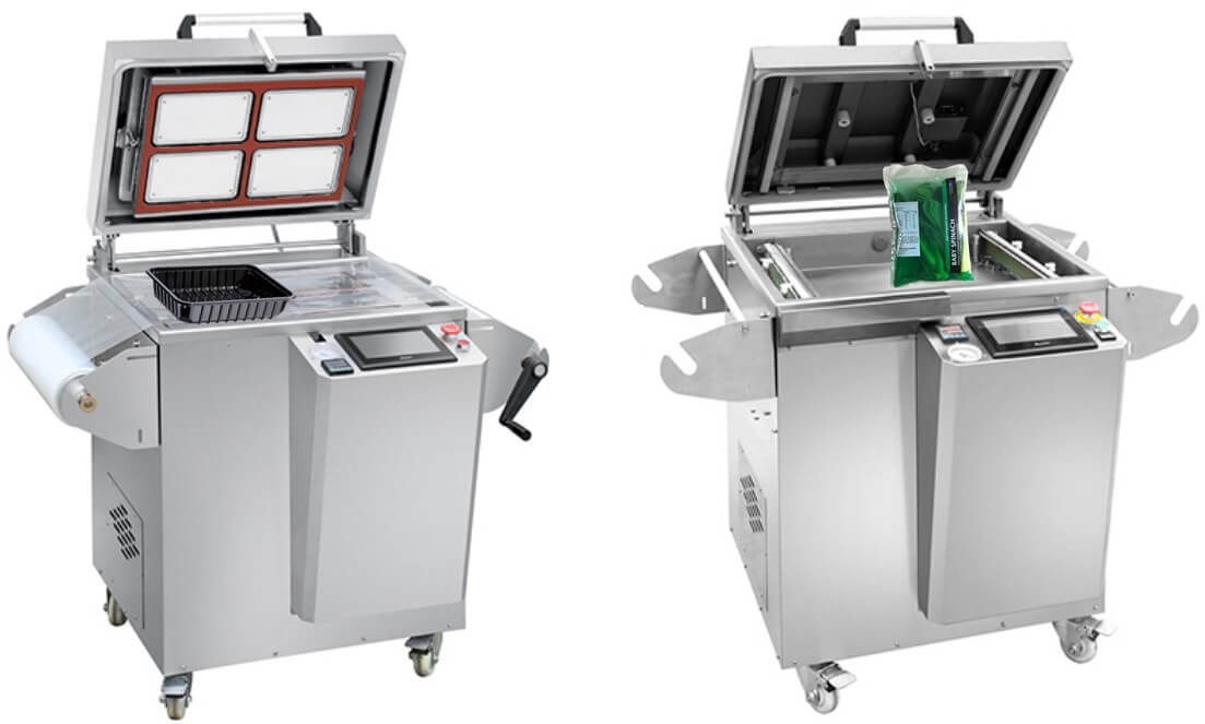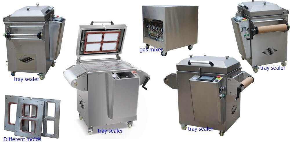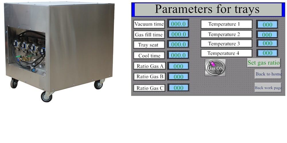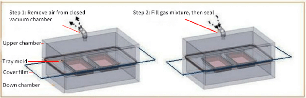 The machine will remove air from tray, then fill modified gas into tray, and seal cover film. Whole process happens in a closed chamber. Oxygen gas (O2). It keep fresh cell sleep but still alive. Carbon Dioxide gas(CO2). Inhibit the growth of aerobic bacteria. Nitrogen gas (N2). Does not have special function. Nitrogen gas fill after vacuum, it protect good tray shape under atmospheric pressure.