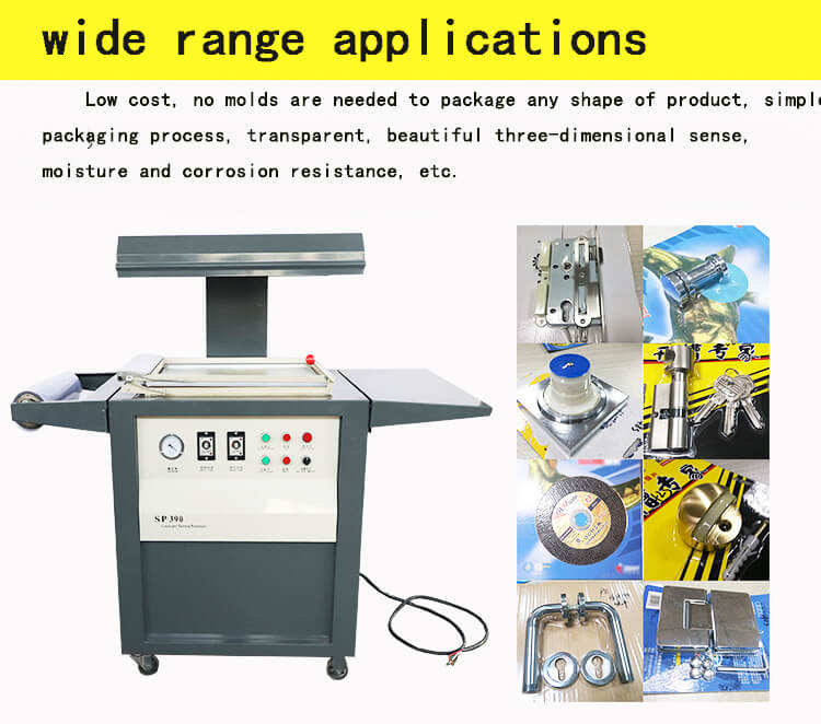 SP-390 vacuum skin packaging machine is widely used in PCB,furniture hardware,screws pack,bamboo products,key chain/badge,ferrite core,lighting products,