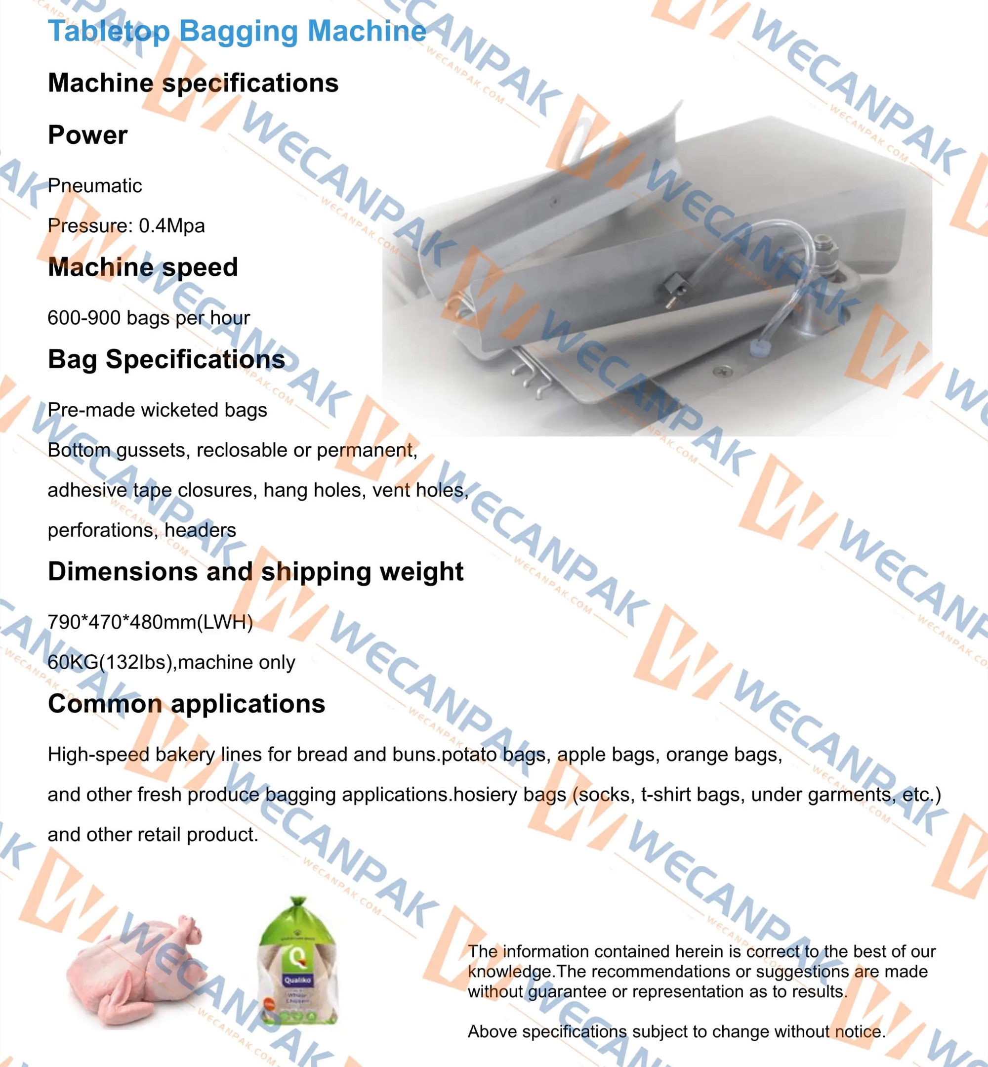 each bagging machine can be adjusted to various poultry sizes, different spoon sizes are available;
