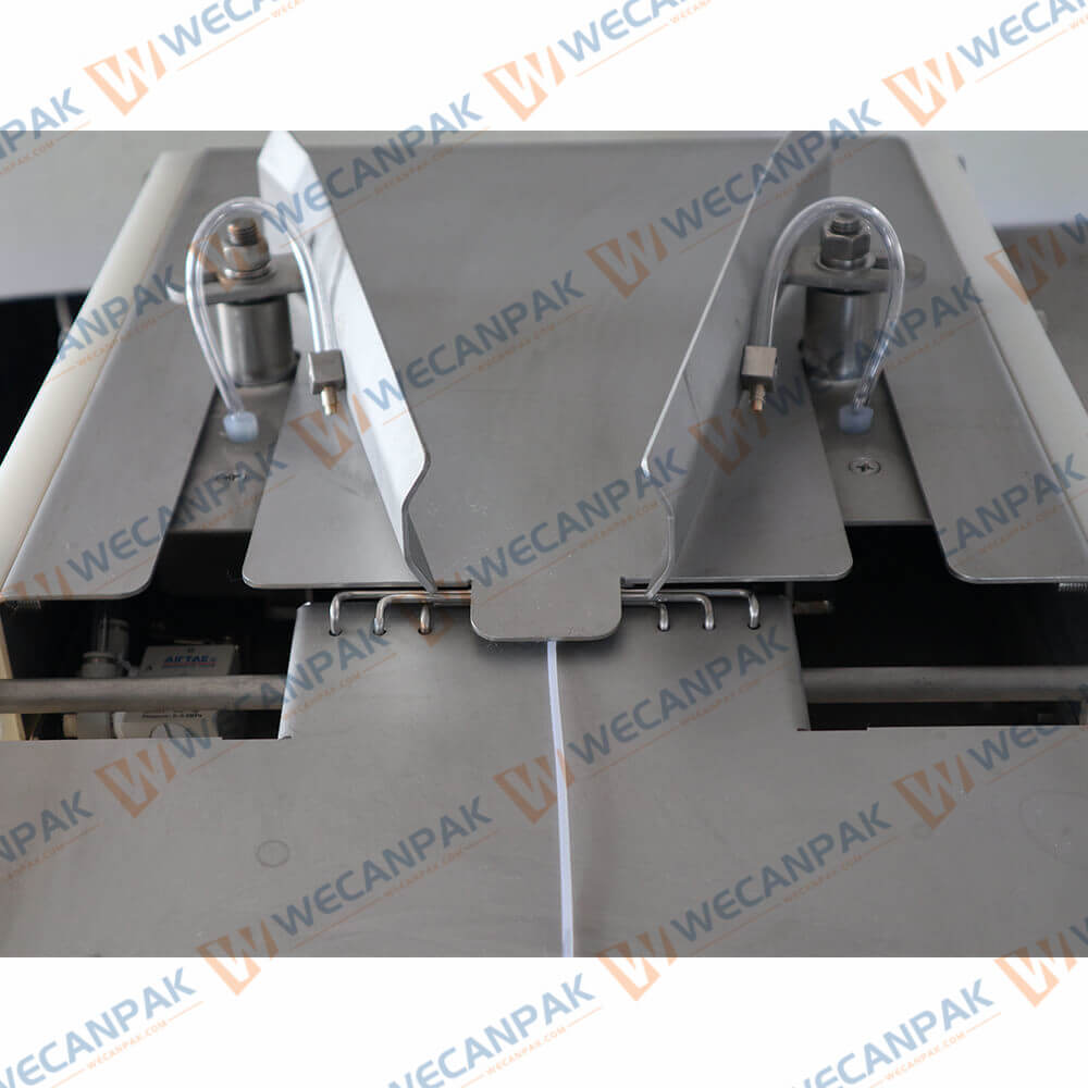 A whole griller is fed to the machine between the white pushing blocks and the packing funnel